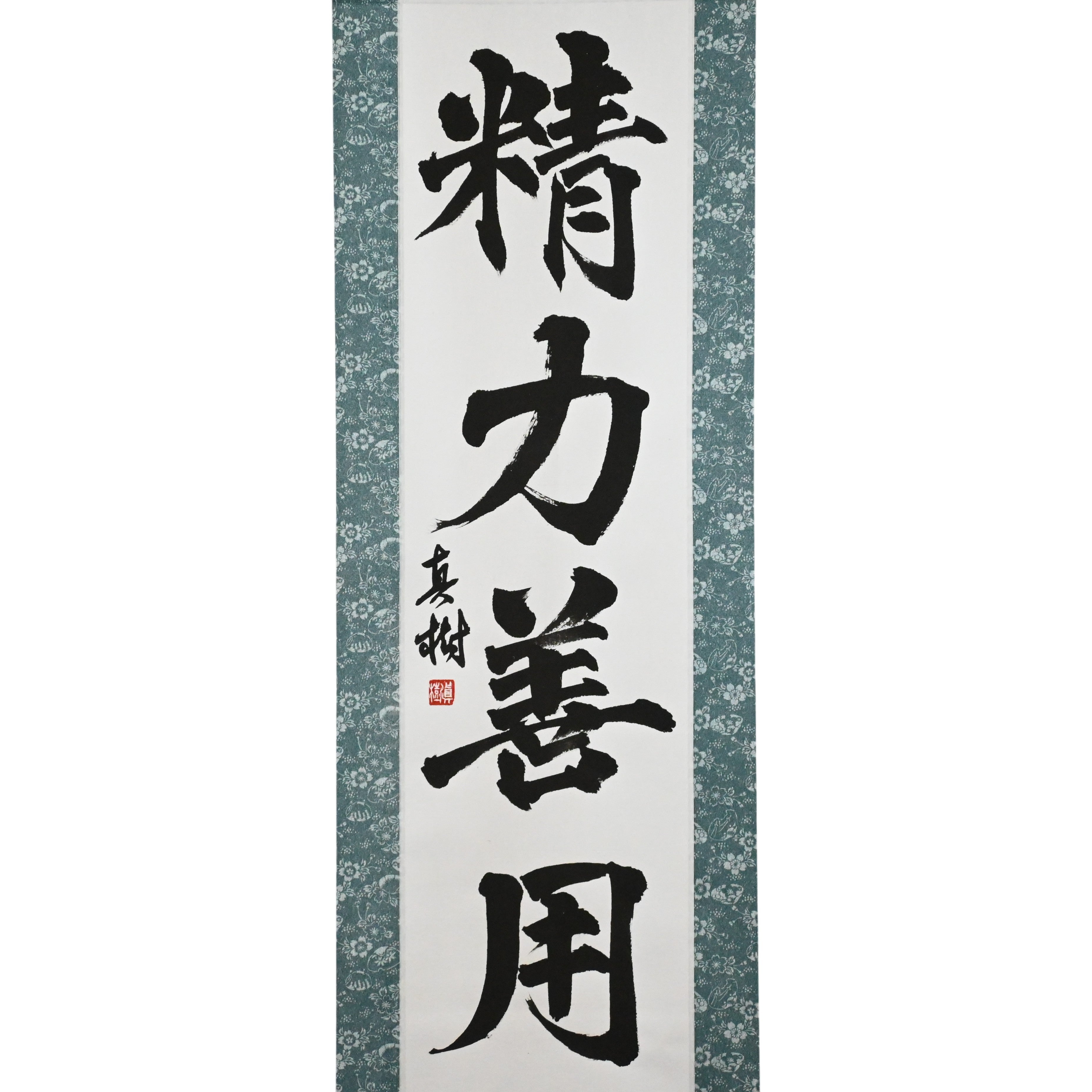 This Japanese calligraphy scroll features the timeless phrase 精力善用 (Seiryoku-Zenyō) — translated as "Maximum Efficient Use of Energy". It is one of the two core principles of Judo, alongside 自他共栄 (Jita-Kyōei, "Mutual Welfare and Benefit"), both established by Judo’s founder, Jigoro Kano (嘉納治五郎).