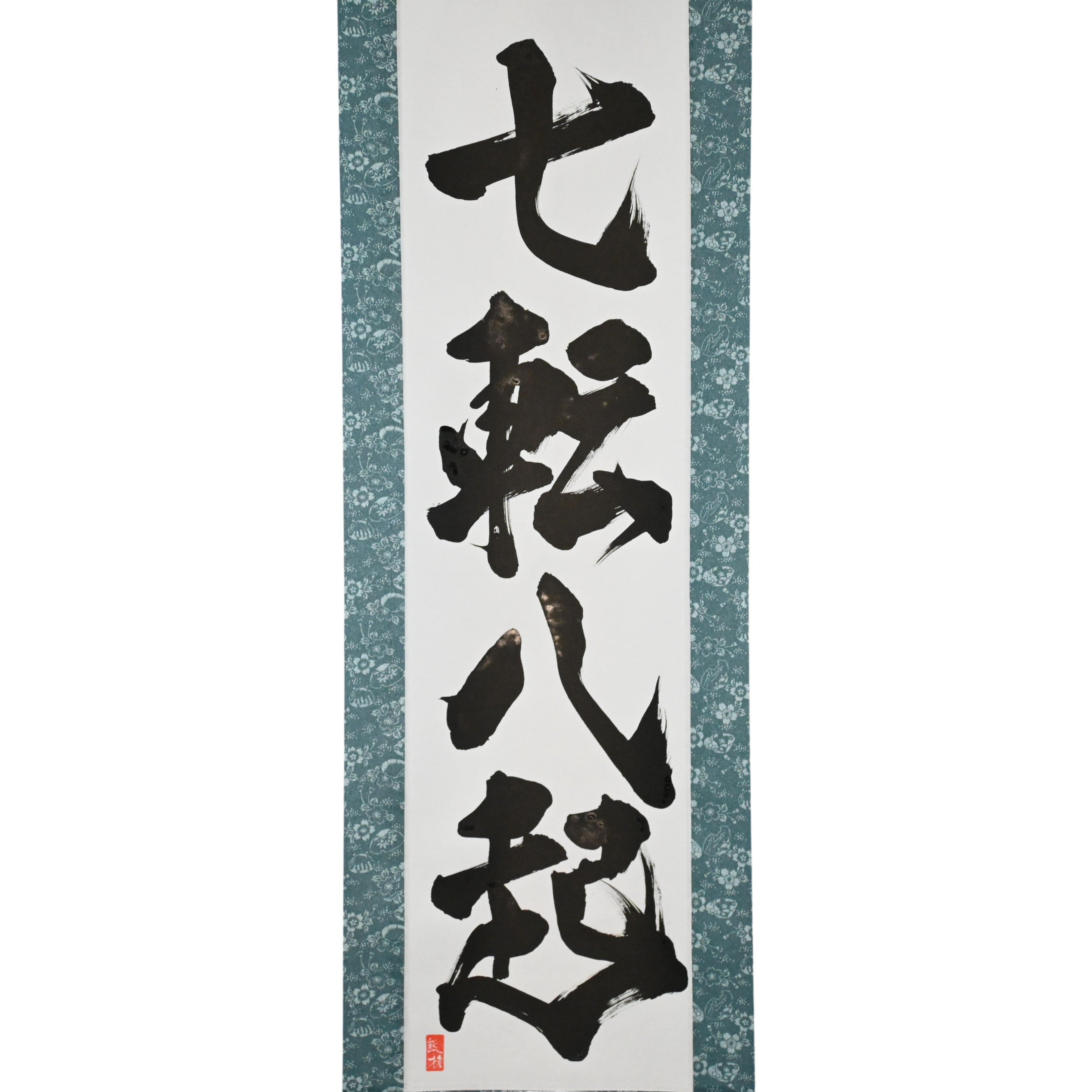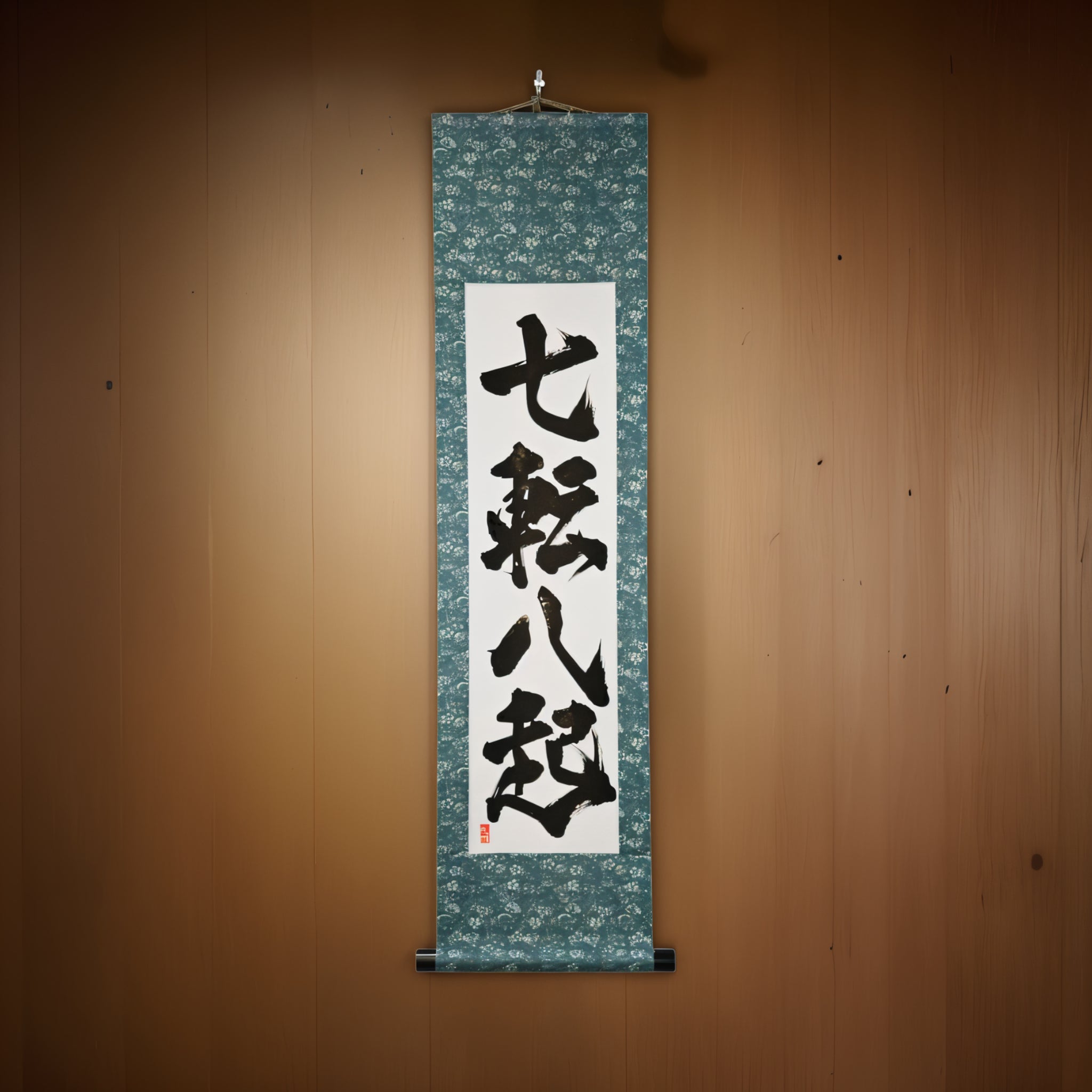 This Japanese calligraphy scroll features the powerful phrase 七転八起 (Shichiten Hakki) — meaning "Fall seven times, rise eight". It embodies the indomitable spirit of the samurai: the unwavering resolve to rise again, no matter how many times life knocks you down.